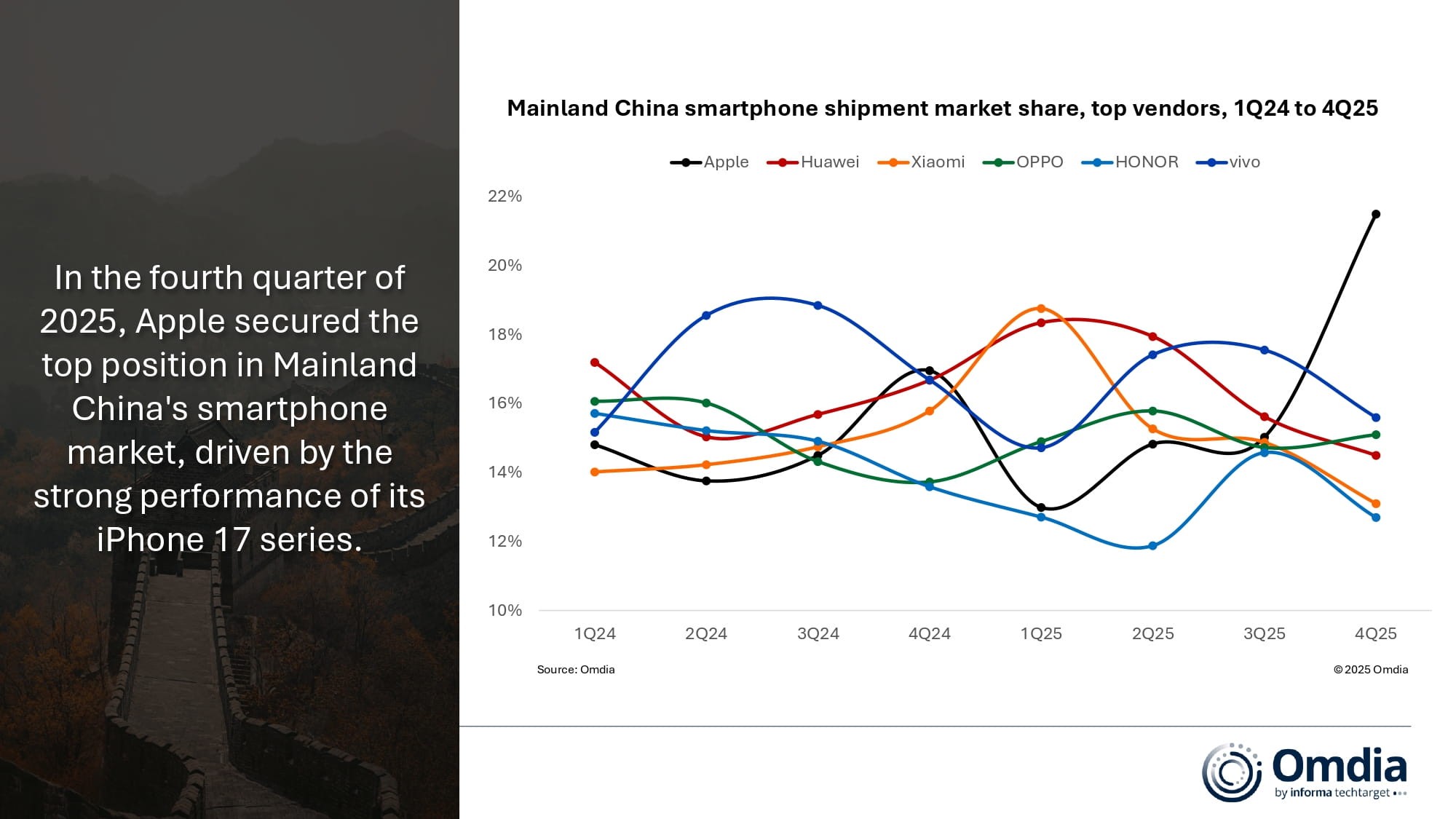 按照Omdia公司的最新研究,2025 年中国智妙手机市场同比下降 1%,全年出货量达到 2。823 亿部。华为出货量为 4680 万部,沉回榜首,占17%的市场份额。vivo 以 4600 万部的出货量紧随其后,位居第二,市场份额为 16%。得益于第四时度的强劲表示,苹果连结了前三名的,全年出货量为 4590 万部。小米出货 4370 万部,别离占领第四和第五的。