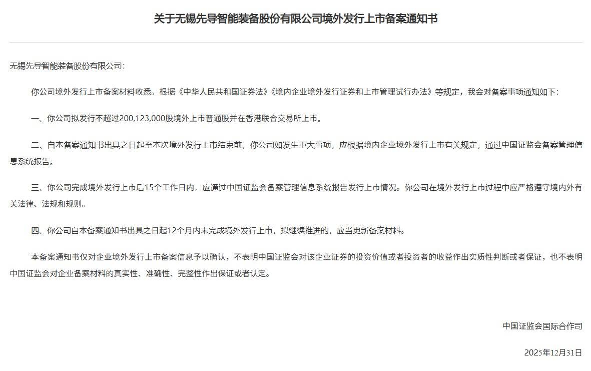 智通财经APP获悉,1月21日,中国证监会国际合做司发布《关于无锡先导智能配备股份无限公司境外刊行上市存案通知书》。先导智能(300450。SZ)拟刊行不跨越200,123,000股境外上市通俗股并正在结合买卖所上市。
